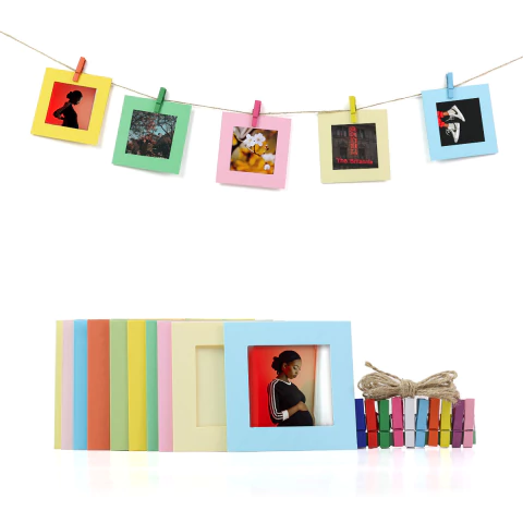 Com ele, você consegue exibir suas fotos no formato polaroid nos suportes para foto coloridos, com prendedores coloridos também.