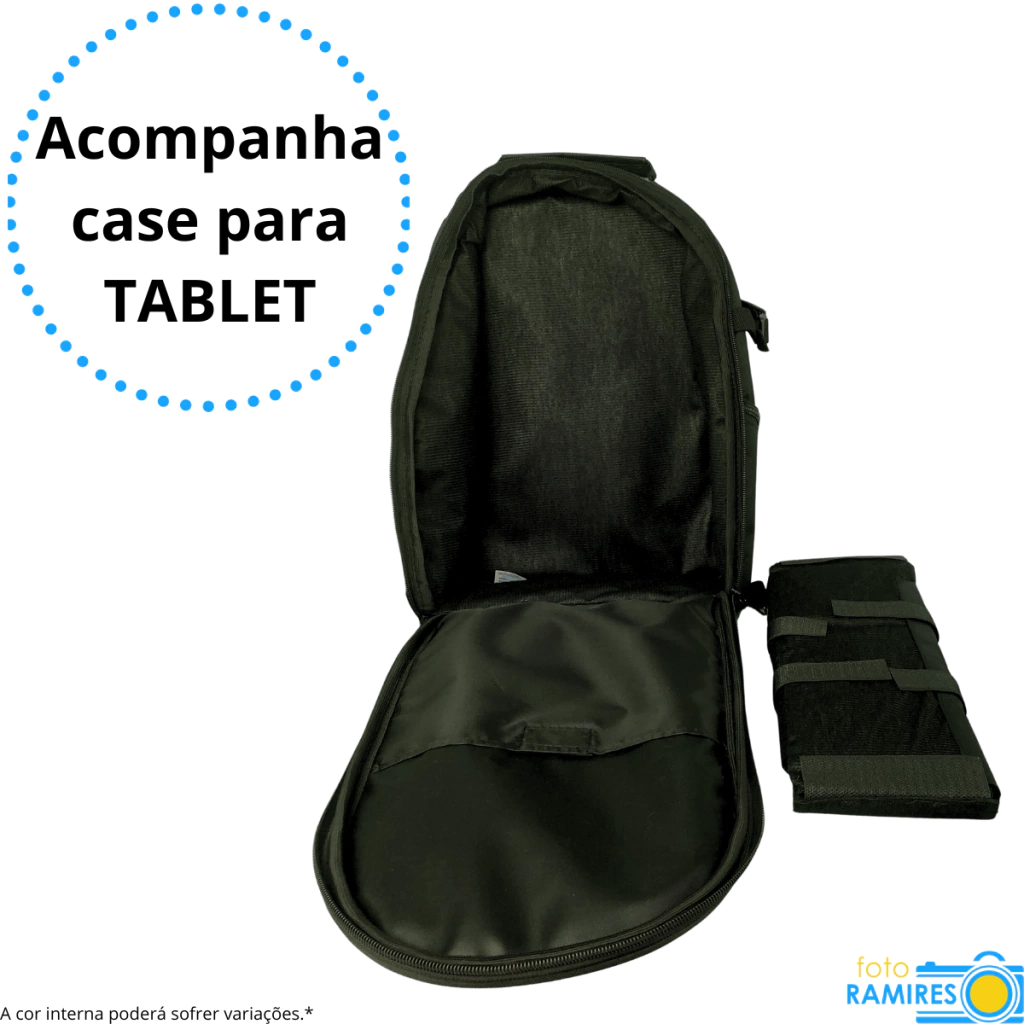 Medidas internas: comp. 21cm (base do case) X altura 35cm X largura (profundidade) 13cm. Com case interno para tablet de 10 polegadas.